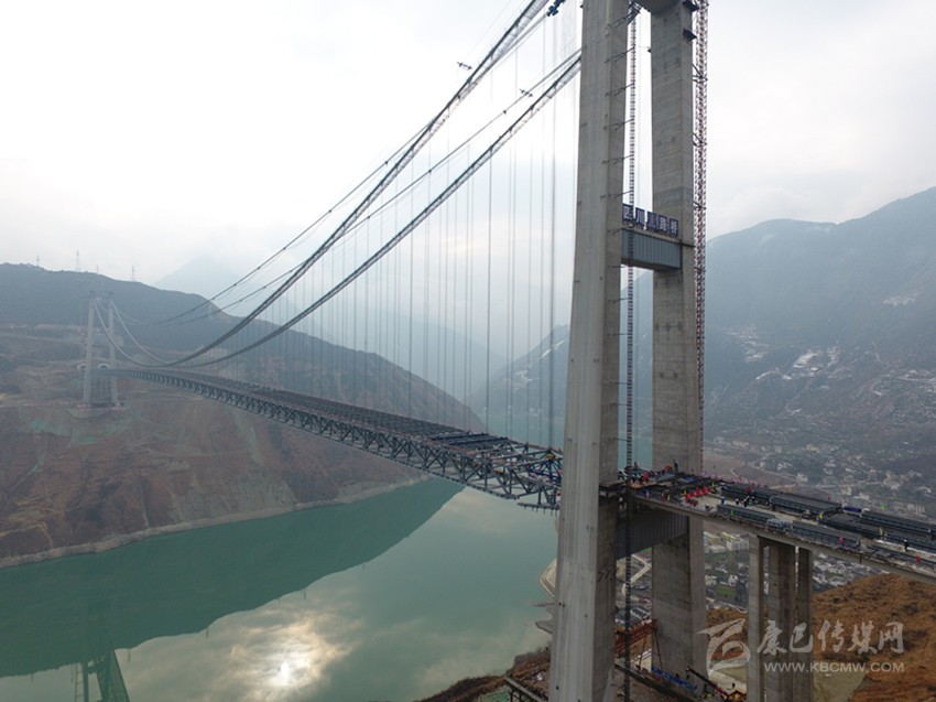 “大橋鋼桁梁完成合龍,標(biāo)志著大橋全面進(jìn)入橋面施工階段,也標(biāo)志著這座建設(shè)在高海拔、高地震烈度帶、復(fù)雜風(fēng)場(chǎng)環(huán)境下的超大跨徑鋼桁梁懸索橋,施工中最難、風(fēng)險(xiǎn)最大的施工全面完工?!毖趴蹈咚夙?xiàng)目部副經(jīng)理柏國(guó)勝激動(dòng)地說。