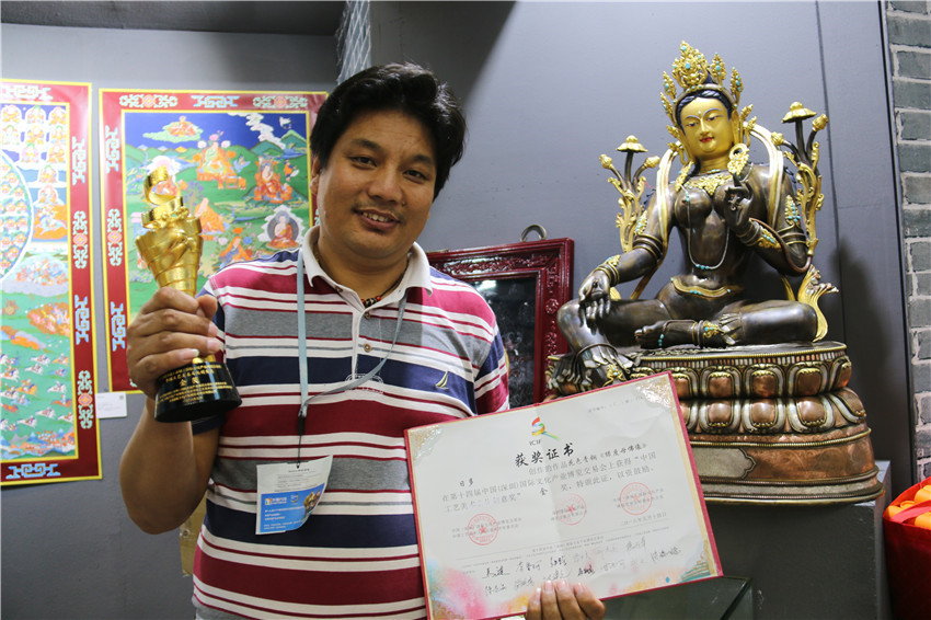 本網(wǎng)訊(記者 宋志勇 文/圖)5月14日,歷時(shí)5天的2018年第十四屆中國(guó)(深圳)國(guó)際文化產(chǎn)業(yè)博覽交易會(huì)(以下簡(jiǎn)稱(chēng)深圳文博會(huì))圓滿(mǎn)落幕。我州憑借花色青銅《綠度母佛像》作品摘得“中國(guó)工藝美術(shù)文化創(chuàng)意獎(jiǎng)”金獎(jiǎng),成為本屆文博會(huì)大眾關(guān)注的焦點(diǎn)。