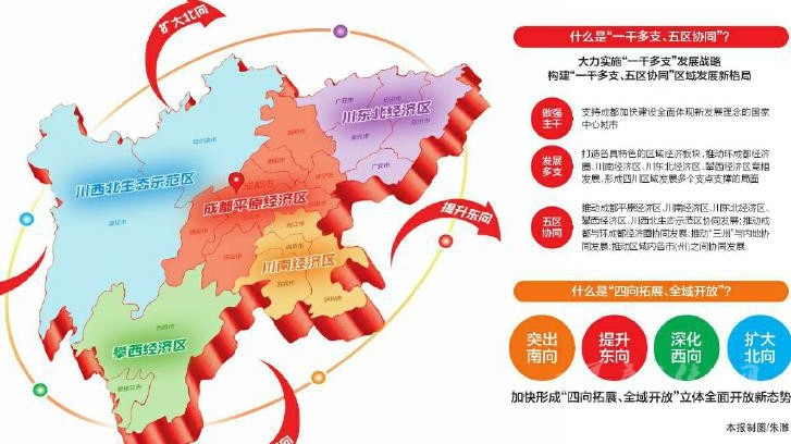 新格局瞄準的一系列新目標讓大家眼前一亮:看區(qū)域發(fā)展,“一干”就是要充分發(fā)揮成都引領(lǐng)輻射帶動作用,“多支”就是要打造各具特色的區(qū)域經(jīng)濟板塊,“五區(qū)協(xié)同”就是要推動五個經(jīng)濟區(qū)協(xié)同發(fā)展;看對外開放,東南西北四個方向都有大文章。