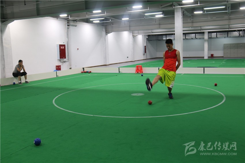 記者隨后被工作人員帶到了蹴球訓(xùn)練場(chǎng)地,只見在一個(gè)10米×10米的正方形平地上,一個(gè)運(yùn)動(dòng)員腳跟著地,用腳掌擠壓球,去擊中場(chǎng)內(nèi)球。