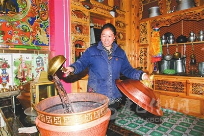 寬敞的院壩,卵石鋪就的花臺(tái)花開爭艷,獨(dú)立的衛(wèi)生間和廚房里,現(xiàn)代廚衛(wèi)一樣不缺,三個(gè)冰柜擺滿了食品,燒烤爐擺在廚房一角。走進(jìn)頂真的客廳,55吋的液晶電視,造型典雅別致的碗柜,琳瑯滿目的各式器皿,藏桌上擺滿了水果和飲料。坐在“豪華”的客廳里,頂真幸福開懷。