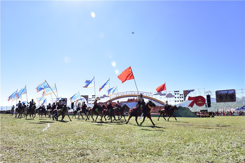 “四山旗似晴霞卷,萬馬蹄如驟雨來”。上午十點,石渠縣四個片區(qū)組成的四個馬隊方陣高舉印有“世界最美濕地”“千年唐蕃古道”“石刻藝術(shù)王國”“吉祥太陽部落”字樣的四色彩旗,眾星拱月般簇擁著中華人民共和國國旗和慶祝中華人民共和國成立70周年活動標識,策馬入場,拉開了2019中國·石渠—太陽部落帳篷狂歡節(jié)的帷幕。