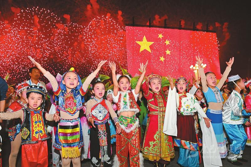 “祖國(guó)萬(wàn)歲!”當(dāng)“光影屏”組成這四個(gè)閃亮的大字,全場(chǎng)沸騰,各族各界聯(lián)歡群眾整齊劃一的喊聲響徹天際。