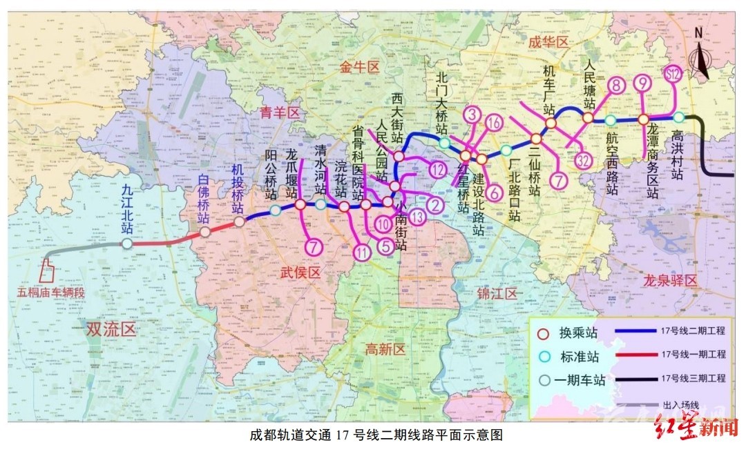 紅星新聞?dòng)浾吡私獾剑?7號(hào)線一期工程已于2017年1月開工建設(shè),計(jì)劃于2020年12月底建成投入試運(yùn)營。本次環(huán)評(píng)公示的17號(hào)線二期工程位于成都市雙流區(qū)、武侯區(qū)、青羊區(qū)、金牛區(qū)和成華區(qū),工程起于一期工程機(jī)投橋站(不含),止于高洪片區(qū)的高洪村站(含),線路自西向東沿永康路-晉陽路-龍騰東路-大石西路-小南街-北較場西路-成華街-張家巷-建設(shè)北路-二仙橋北路-航天路敷設(shè)。線路長約24.8km,均為地下線路,共設(shè)置地下車站18座,其中有換乘站12座。