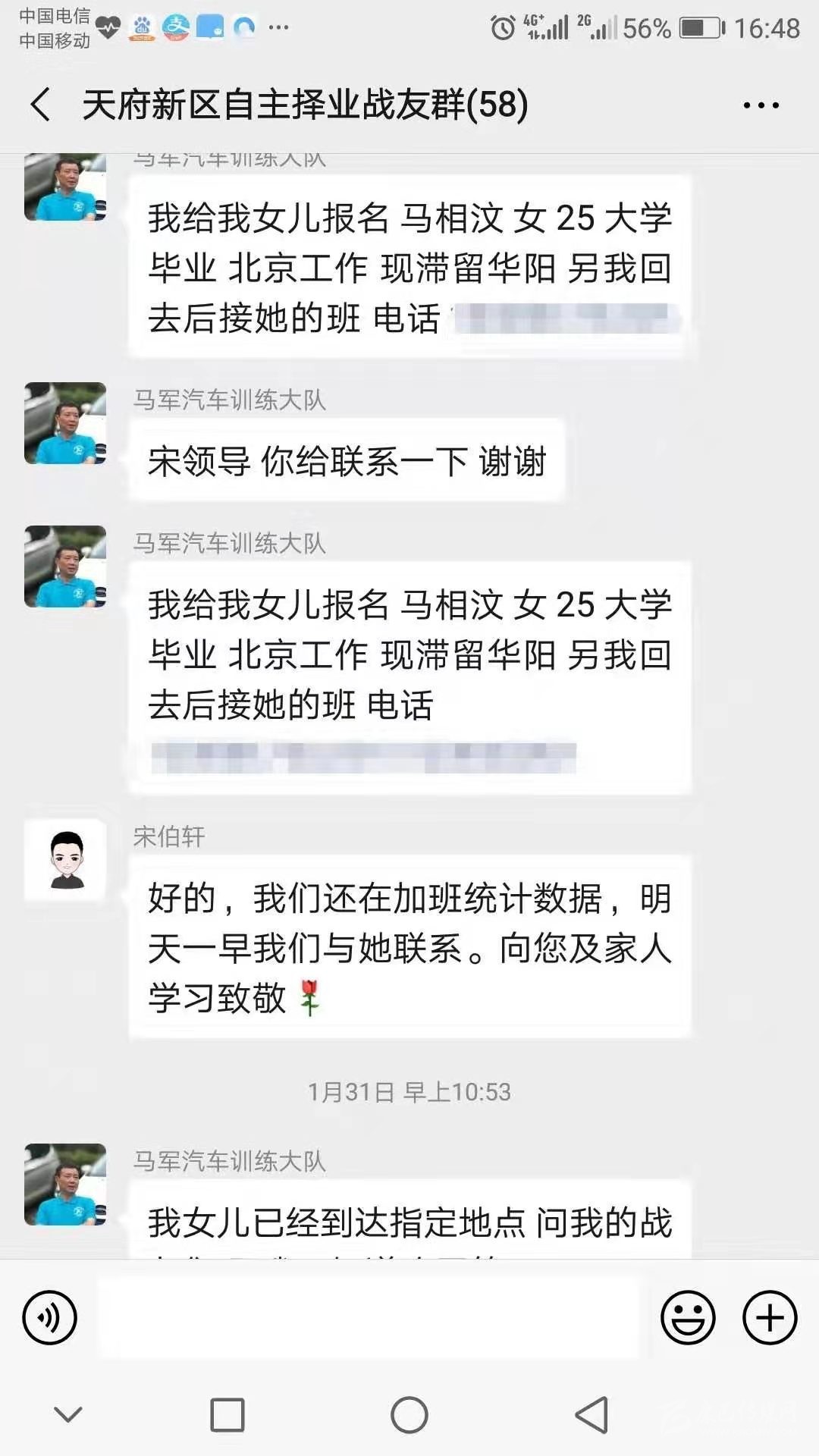 “我給我女兒報(bào)名,馬相汶,女,25歲,大學(xué)畢業(yè),北京工作,現(xiàn)滯留成都,另我回去后接她的班。”近日,一條微信截圖傳遍了天府新區(qū)退役軍人的朋友圈。