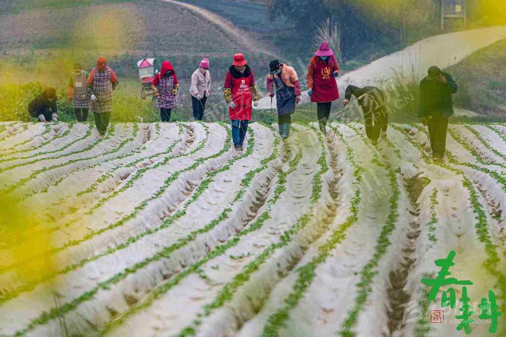 閬中市彭城鎮(zhèn)五谷臺村,村民在精心管護(hù)蔬菜,把菜苗從薄膜里“掏出來”。