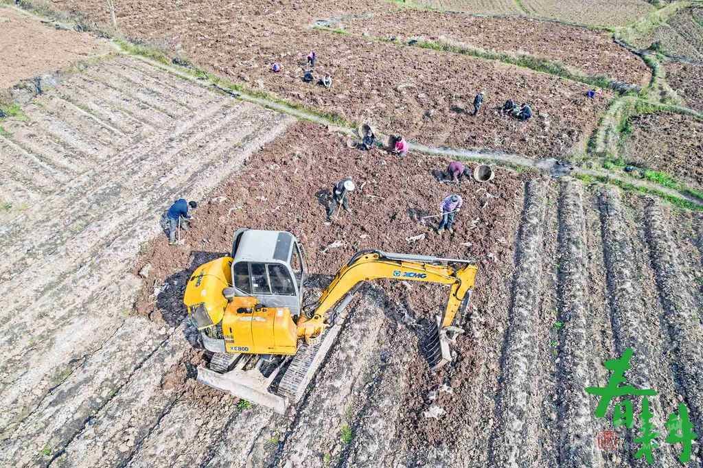 閬中市彭城鎮(zhèn)五谷臺村,機(jī)械正在菜地里開溝起壟施底肥,村民在播種蓋土。