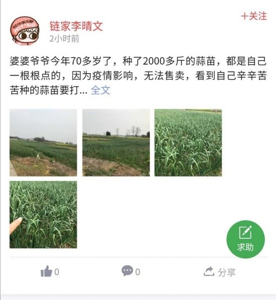 “婆婆爺爺今年70多歲了,種了2000多斤的蒜苗,都是自己一根根點(diǎn)的,因?yàn)橐咔橛绊懀瑹o(wú)法售賣,看到自己辛辛苦苦種的蒜苗要打水漂,兩個(gè)老人都要急哭了?!奔易〕啥寂碇菔械睦钚〗阃ㄟ^(guò)“抱團(tuán)助農(nóng)戰(zhàn)疫”平臺(tái)求助表示,希望能夠幫忙盡快處理這些蒜苗。