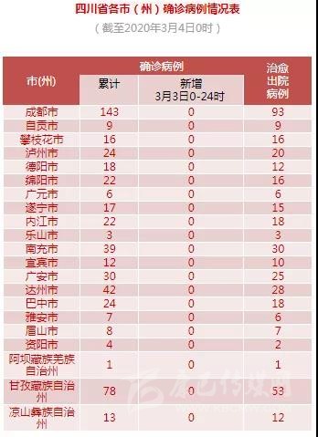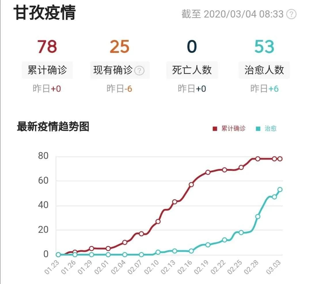 截至3月3日24時(shí),我州累計(jì)報(bào)告確診病例78例,累計(jì)治愈出院53人(道孚縣48人、康定市2人、色達(dá)縣2人、稻城縣1人),其余25人均在定點(diǎn)醫(yī)院隔離治療,203名密切接觸者正在接受醫(yī)學(xué)觀察。我州道孚縣連續(xù)5天無(wú)確診病例報(bào)告,其余17個(gè)縣(市)連續(xù)29天無(wú)確診病例報(bào)告。各縣(市)確診病例情況表疫情實(shí)時(shí)追蹤(截至2020年3月3日24時(shí))縣(市)累計(jì)病例新增病例道孚縣730康定市20色達(dá)縣20稻城縣10溫馨提示: