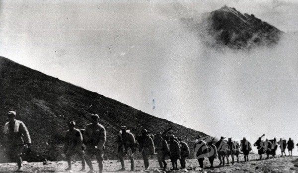 圖為進軍西藏途中的十八軍戰(zhàn)士,背后是高聳入云的山峰。圖片來源:網絡