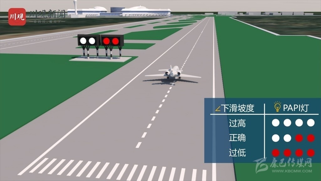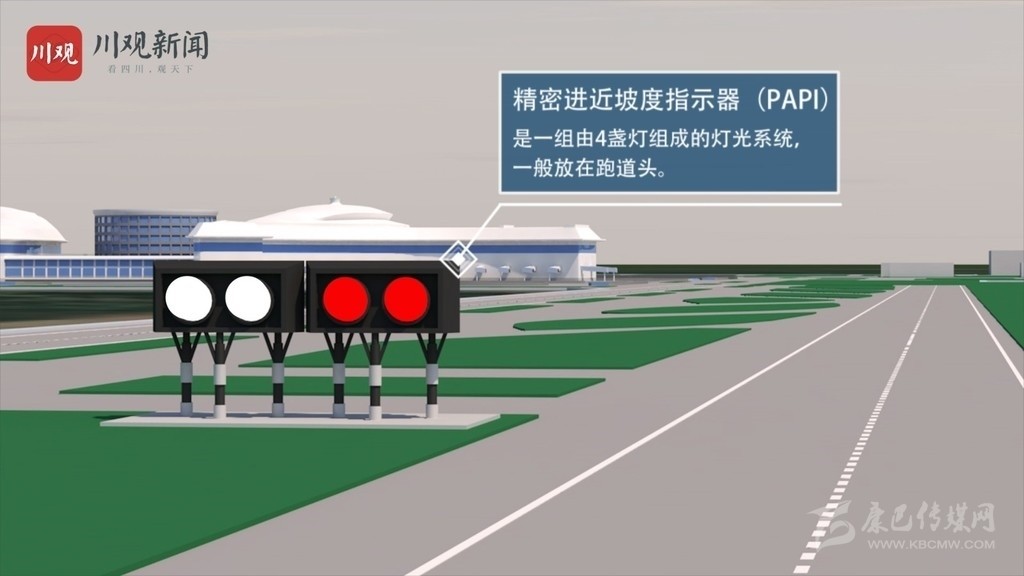 緊密進(jìn)近坡度指示器(PAPI),是一組由4盞燈組成的燈光系統(tǒng),一般放在跑道頭。飛行員從空中觀察,如果高于預(yù)定下滑道,PAPI燈顯示全白,反之則顯示全紅。飛行員如果看到兩紅兩白的PAPI燈,就說(shuō)明飛機(jī)下滑坡度正確,能夠安全降落。