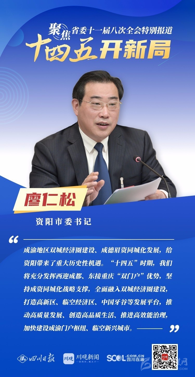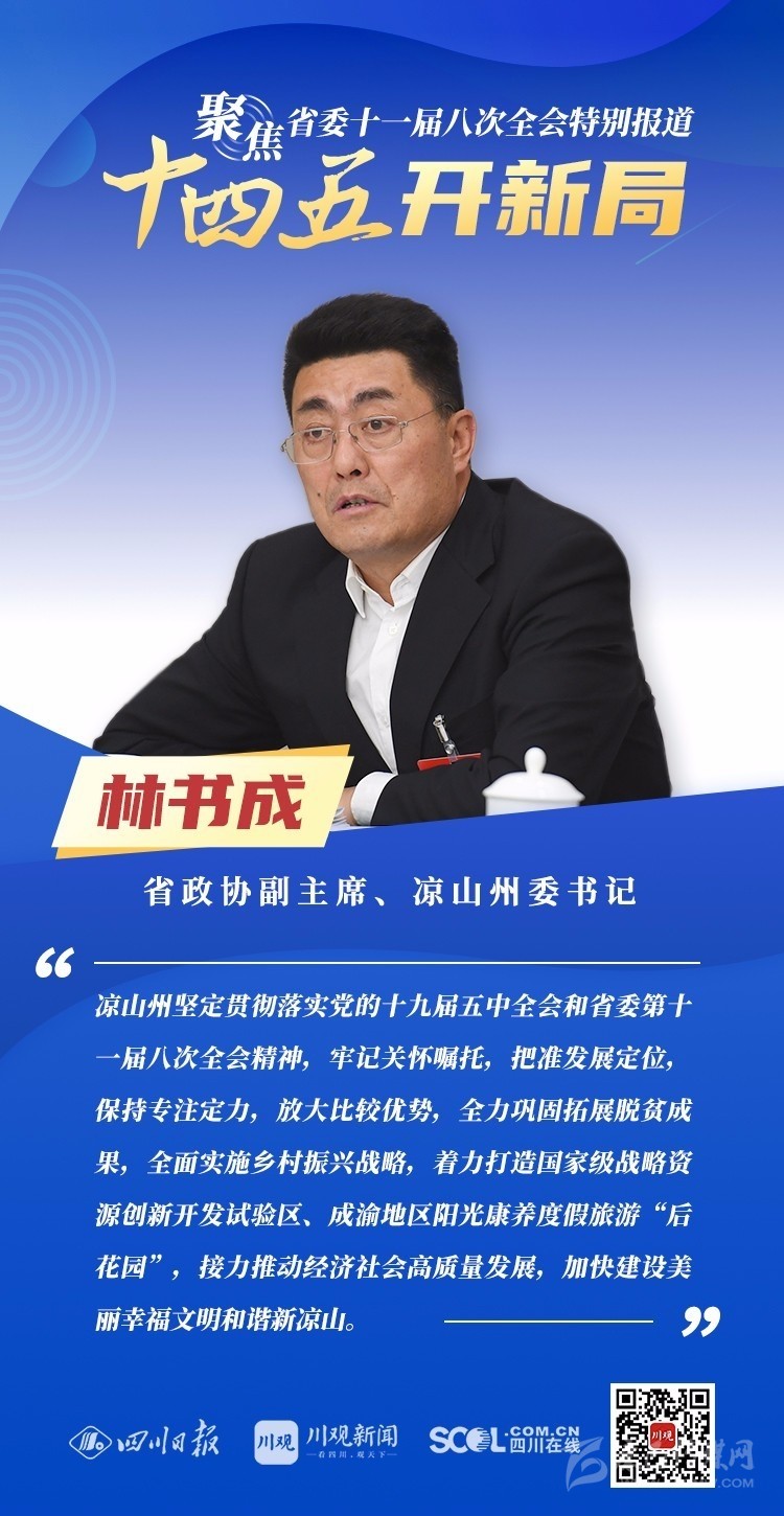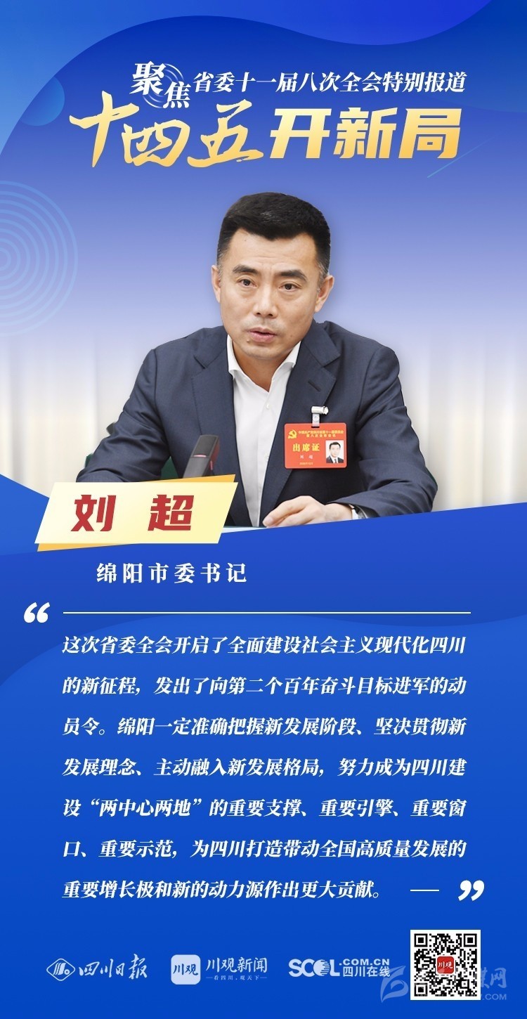 12月3日,中共四川省委十一屆八次全會在成都開幕,全會將深入學習貫徹黨的十九屆五中全會精神,審議《中共四川省委關(guān)于制定四川省國民經(jīng)濟和社會發(fā)展第十四個五年規(guī)劃和二〇三五年遠景目標的建議(討論稿)》,為未來5年乃至更長時期四川發(fā)展謀劃新藍圖 。