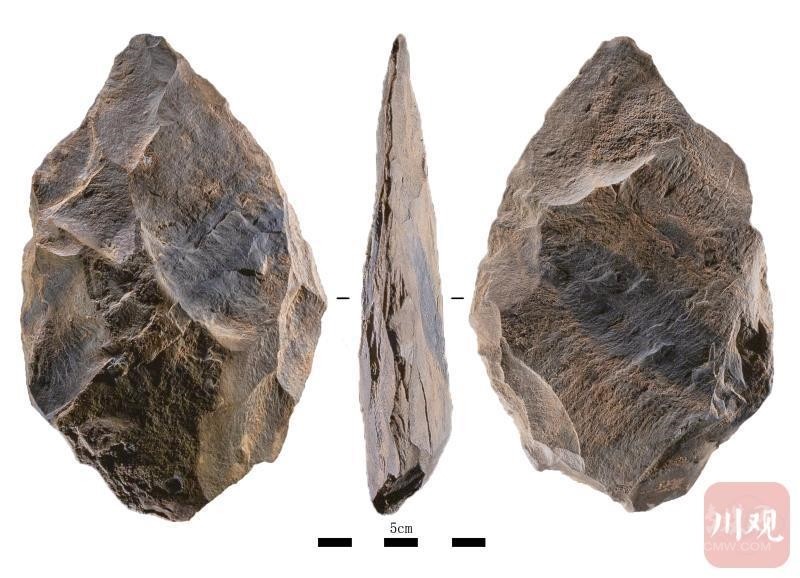這塊有一端很尖的石頭,據(jù)說(shuō)叫小型兩面器,看上去和手斧有點(diǎn)像,但比手斧小很多,目前在國(guó)內(nèi)舊石器時(shí)代尚屬首次發(fā)現(xiàn)。原來(lái),它就是從石塊上打下的石片經(jīng)過(guò)加工后而成。它的邊緣頗為鋒利,端部尖銳,同樣具有切割、鉆孔等多種功能。