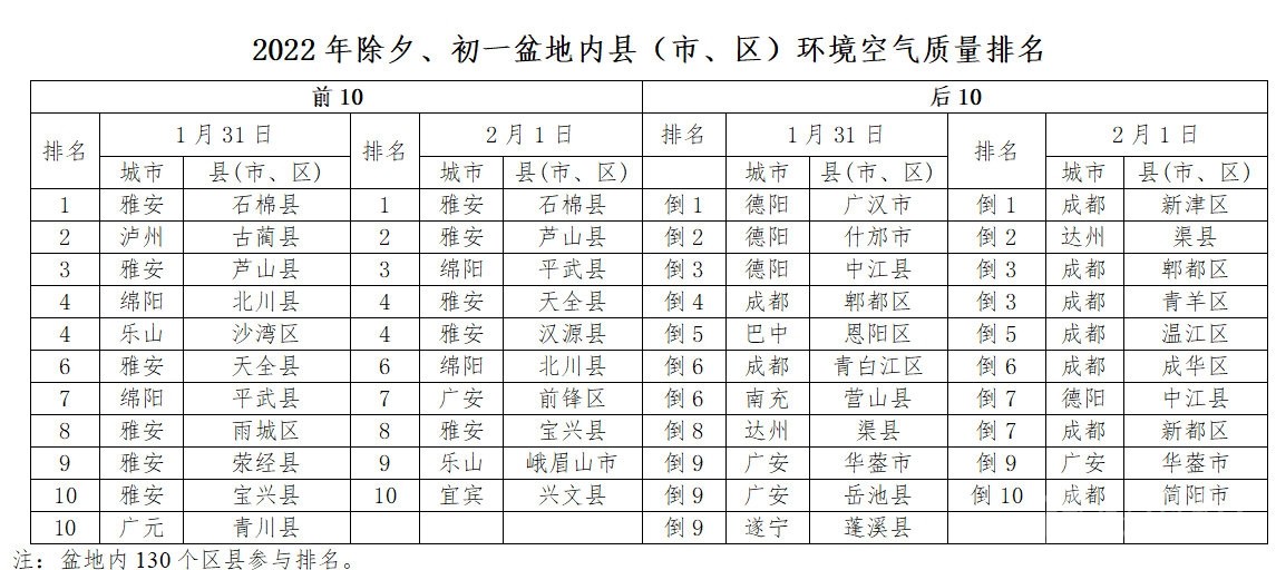 為督促各地加強(qiáng)煙花爆竹燃放管控,四川省生態(tài)環(huán)境廳還對盆地內(nèi)130個(gè)縣市區(qū)的空氣質(zhì)量進(jìn)行了排名。