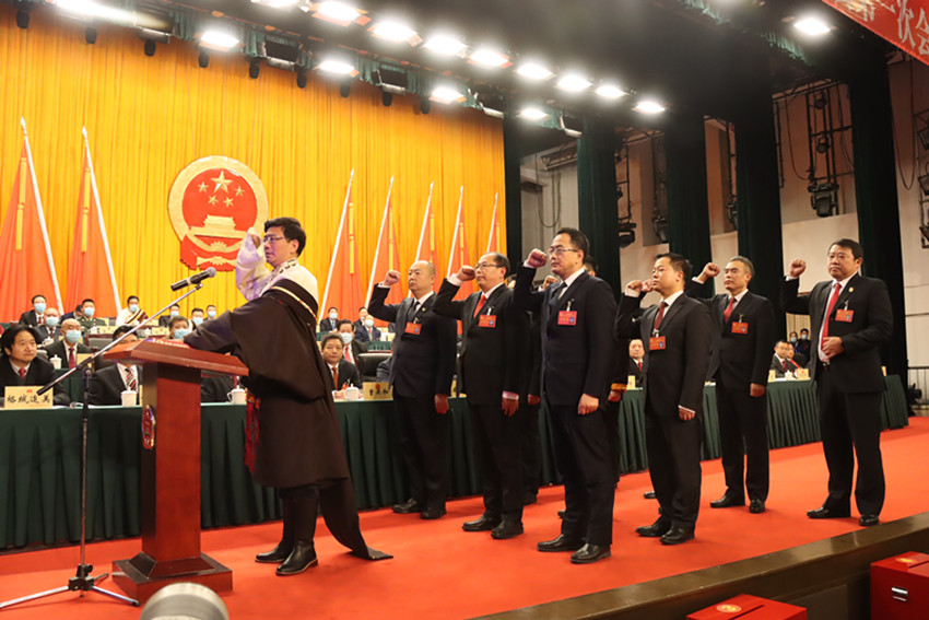 州十三屆人大一次會(huì)議上,當(dāng)選的州政府班子成員和州監(jiān)察委員會(huì)主任、州中級(jí)人民法院院長向憲法宣誓。