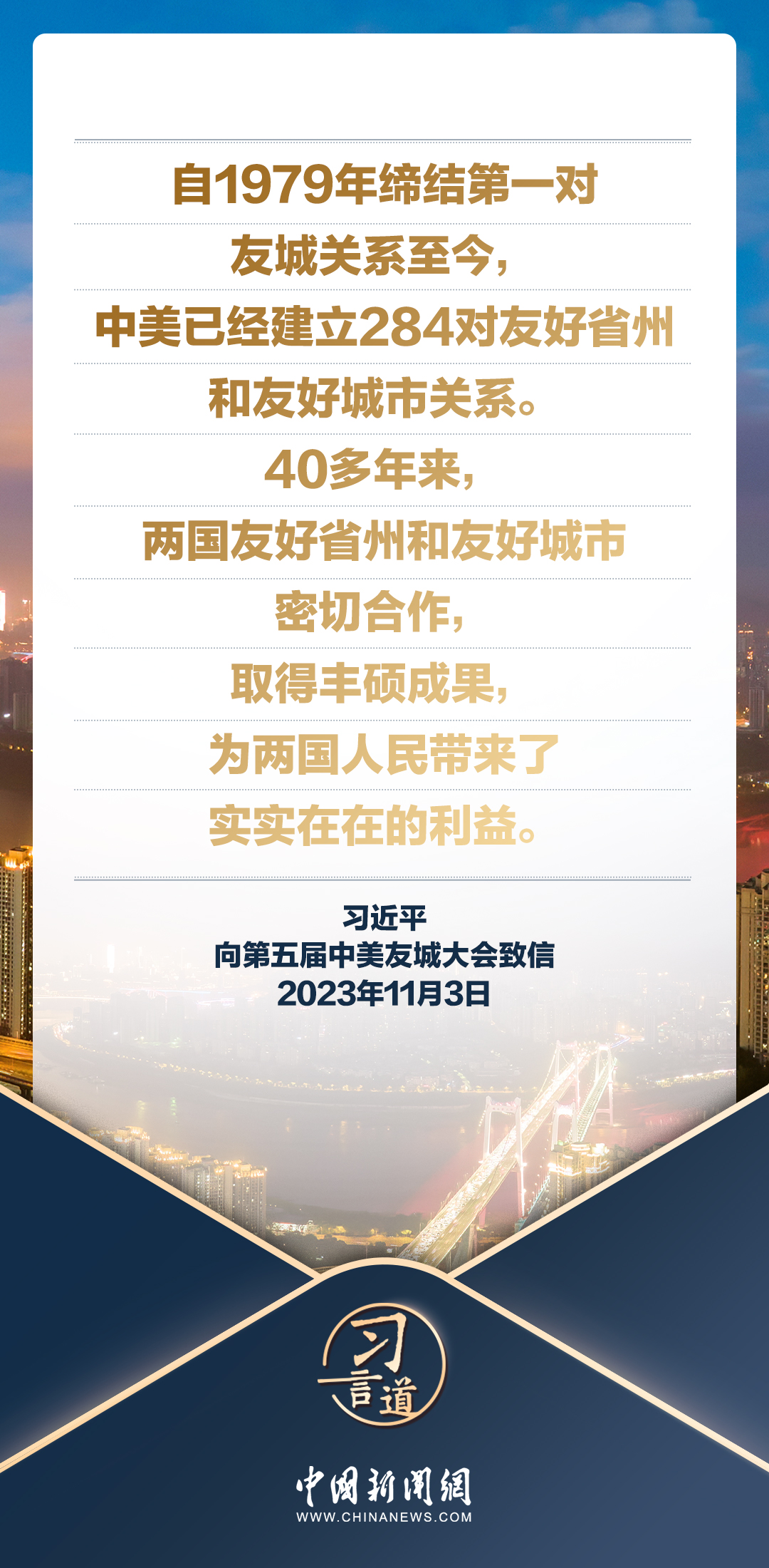 11月3日,國家主席習近平向第五屆中美友城大會致信。習近平指出——