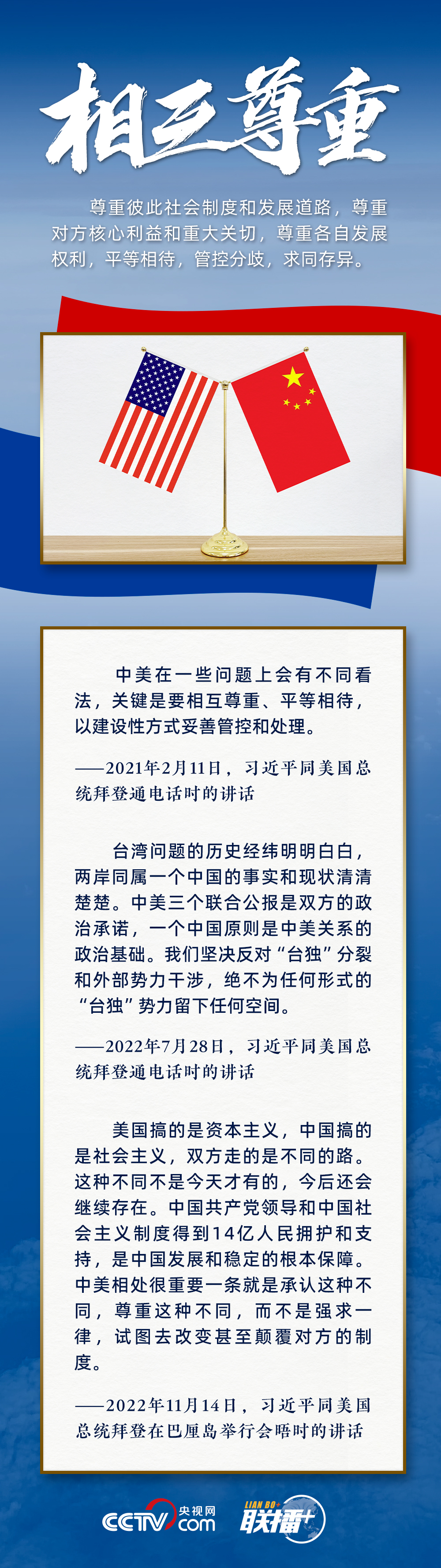 “中美關(guān)系不是一道是否搞好的選擇題,而是一道如何搞好的必答題?!睂τ谌绾握_把握中美關(guān)系,習近平主席提出新時期中美相處應(yīng)該堅持三點原則。央視網(wǎng)《聯(lián)播+》與您一起學習。