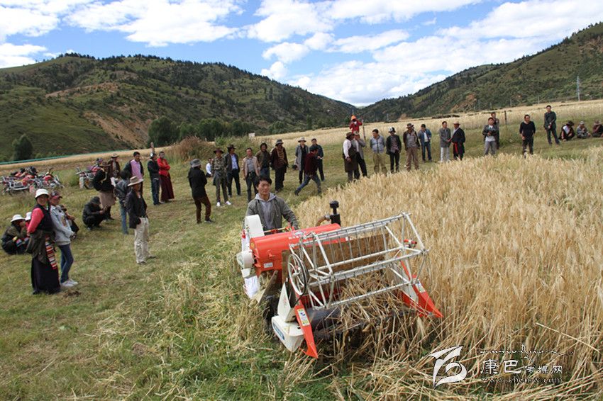 9月14日,在海拔3600多米的理塘縣甲洼鄉(xiāng)下依村成熟青稞地里,縣農(nóng)牧和科技局的農(nóng)機(jī)手正用小型聯(lián)合收割機(jī)示范收割青稞。7個(gè)行政村的村支書、村主任在現(xiàn)場(chǎng)觀摩學(xué)習(xí)。俄曲村支書洛真說(shuō):“這個(gè)小型聯(lián)合收割機(jī)很適合我們高原,這將大大減輕我們的勞動(dòng)強(qiáng)度,不用再擔(dān)心下雨影響搶收。” (葉強(qiáng)平 攝影報(bào)道)