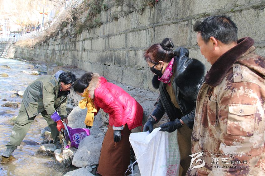 冬季的折多河水流量少,河水較淺,河道邊有許多地方都裸露出來(lái)。記者看見(jiàn),有兩男兩女腳穿水靴踩在河邊正在撿拾樹(shù)枝、菜葉、白色塑料袋等雜物,其中一個(gè)男子雙手都攥滿了爛菜葉,其余三個(gè)人手里也都拎著一個(gè)滿滿的編織袋。記者上前和那名手攥爛菜葉的男子進(jìn)行交談,得知他們并不是拾荒者,而是康定市市政管理局專(zhuān)門(mén)負(fù)責(zé)清理河道衛(wèi)生的清潔工。