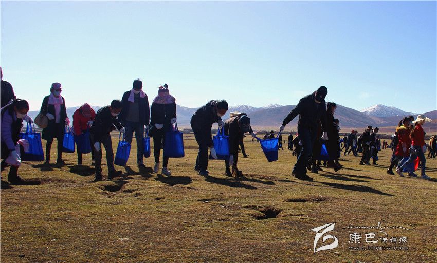 5月11日,距石渠縣城約5公里處的草原上人聲鼎沸,格外熱鬧。一大早,來自各單位的300余名黨員干部便聚集到了這里,身穿紅背心的青年志愿者們正忙著為大家分發(fā)口罩、手套等勞動物品。而在人群最前端,一輛拖拉機滿載著一車類似飼料的東西,七八個人正有條不紊地將“飼料”卸車并分裝進(jìn)數(shù)百個藍(lán)色環(huán)保袋中。