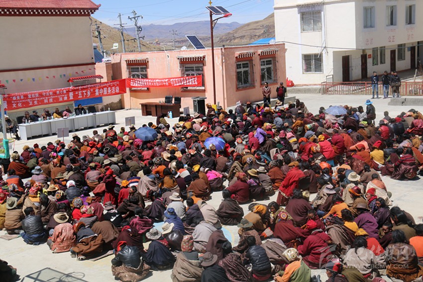 白玉縣牧區(qū)納塔鄉(xiāng),高原烈日下,1000多牧民和僧人盤(pán)腿坐在地上,聚精會(huì)神聆聽(tīng),麥克風(fēng)里傳出抑揚(yáng)頓挫的藏語(yǔ),本地諺語(yǔ)、民間故事配合著扶貧政策、法律法規(guī),通過(guò)一個(gè)個(gè)生動(dòng)的比喻,回響在牧民耳畔。