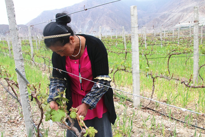 四郎吉村地處半山腰,干旱缺水、土地貧瘠,村民們以前都靠種植青稞來獲得收入?!斑^去,由于缺技術(shù)、葡萄的品質(zhì)不高,我家種的釀酒葡萄賣不出去;現(xiàn)在,太陽魂公司承包了村民們的葡萄園,成立專業(yè)合作社,統(tǒng)一種植、統(tǒng)一管理、統(tǒng)一經(jīng)營,既規(guī)避了風(fēng)險(xiǎn),又為大家?guī)砹撕芎玫慕?jīng)濟(jì)效益?!睂τ诖迕袢是嘀粳攣碚f,生活的好轉(zhuǎn)都起因于小小的葡萄。