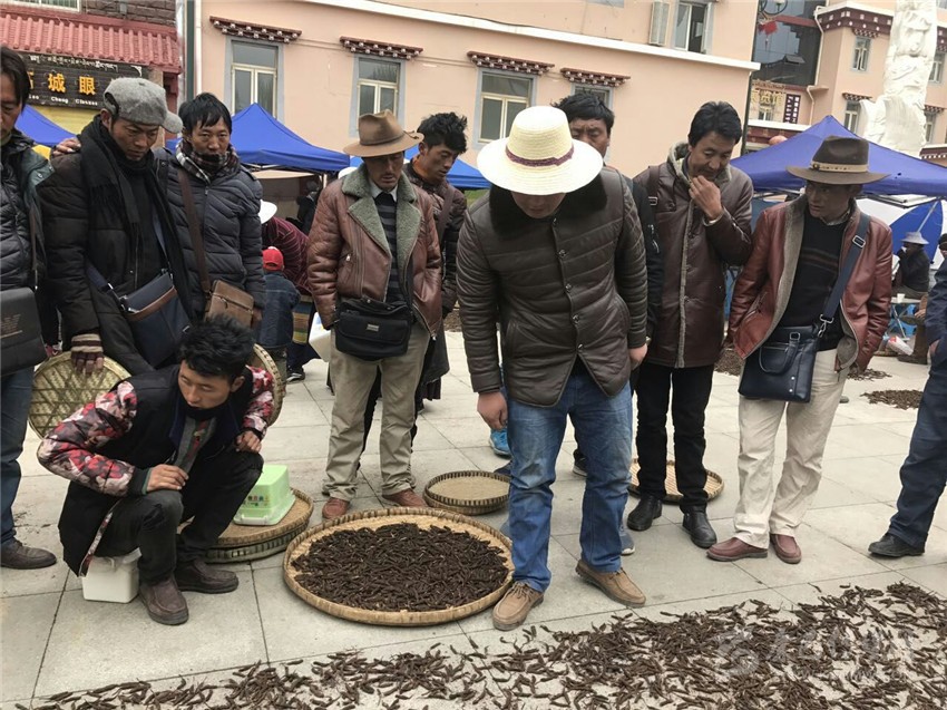 收購商在理塘格薩爾廣場看蟲草。