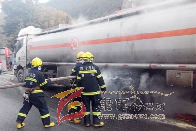 本網(wǎng)訊(夏俊林 文/圖)11月6日上午8點(diǎn)35分,康定縣南郊鬧市區(qū),一輛從稻城亞丁前往成都的油罐車后輪胎著火,沿街商戶行人驚恐逃避,及時(shí)趕來(lái)的消防員,5分鐘將火勢(shì)撲滅。