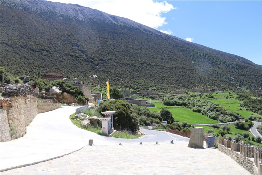 從觀景平臺向村子進(jìn)發(fā),一棟棟用石塊砌成的藏房次第映入眼簾,每一棟藏房都有獨(dú)立的院落,院墻上是堆放整齊的木柴,墻邊是造型別致的花臺,有的房頂上還掛著五星紅旗。走到村口,黑化通村路變成了硬化聯(lián)戶路,道路寬敞整潔,路旁有太陽能路燈、電子監(jiān)控、綠化花草和公共廁所;村中央的廣場上聚滿了人,他們有的是外來游客、有的是當(dāng)?shù)卮迕?,有的在曬著太陽閑聊,有的在對著美景拍照。在村里,記者還發(fā)現(xiàn)有幾個(gè)小賣部、不少私家車和好幾大片長勢良好的菜地,地里有一些人在勞作。