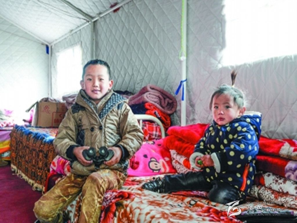 震后的第一個新年,記者在塔公鄉(xiāng)江巴村看到,一頂頂藍(lán)色的棉帳篷有序搭建在村民自家院落里。隆冬時節(jié),寒風(fēng)凜冽,走進(jìn)村民措科家的帳篷,一股熱浪卻撲面而來。小鋼爐上燒著熱水,帳篷里堆放著政府發(fā)放的幾床厚棉被,地上鋪著一層白色的防潮塑料薄膜,措科和三個孩子正圍著爐子烤火。
