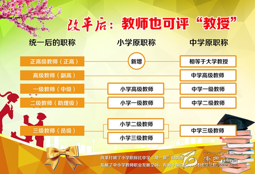 一是中小學教師職稱“天花板”被拆除,可參與全省統(tǒng)一組織的“正高級”職務評定;評定后,工資、福利待遇與大學正教授等同。此項在此次改革中最受關(guān)注。