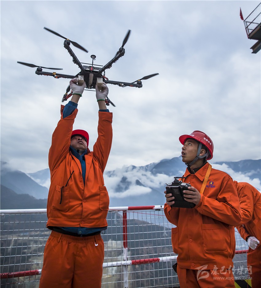 無人機將小繩送到對岸,工作人員再利用小繩拉大繩,最后把鋼繩拉過大渡河架設(shè)牽引系統(tǒng)。