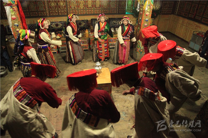 一家人穿上節(jié)日盛裝,按輩序就座。主婦手捧吉祥斗恭恭敬敬地走到長輩跟前說“扎西德勒”,對方抓幾粒麥子邊向上撒邊祝福說:“扎西德勒!美滿幸福,祝主婦身體健康,預(yù)祝明年大家仍如此團聚歡慶?!痹僮ヒ稽c切瑪送進嘴里。家庭儀式后,家中兩人一個拿青稞酒、銀酒碗,一個手捧切瑪,到左鄰右舍、親朋好友家拜年,敬獻切瑪、青稞酒,互相祝福。