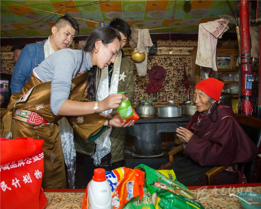 為了及時(shí)將物資送到群眾手中,公益小組一行當(dāng)日凌晨4點(diǎn)便從成都出發(fā),于下午1點(diǎn)到達(dá)走訪地石渠縣。隨后,公益小組不顧舟車(chē)勞頓,堅(jiān)持走訪了10戶(hù)此次“新牧民養(yǎng)成計(jì)劃”示范家庭,為他們送上了生活禮包及文明禮包,并送上了節(jié)日的祝福。年過(guò)七旬的卓嘎是本次“新牧民養(yǎng)成計(jì)劃”示范戶(hù)之一,體弱多病的她堅(jiān)持要迎接公益小組的到來(lái),并獻(xiàn)上哈達(dá)。收到物資后她激動(dòng)地說(shuō),兩年前華僑城來(lái)到石渠縣,為他們帶來(lái)了新棉被,那個(gè)冬天他們一點(diǎn)都不冷,現(xiàn)在又送來(lái)了糧食和生活用品,讓他們可以過(guò)上更好的生活。