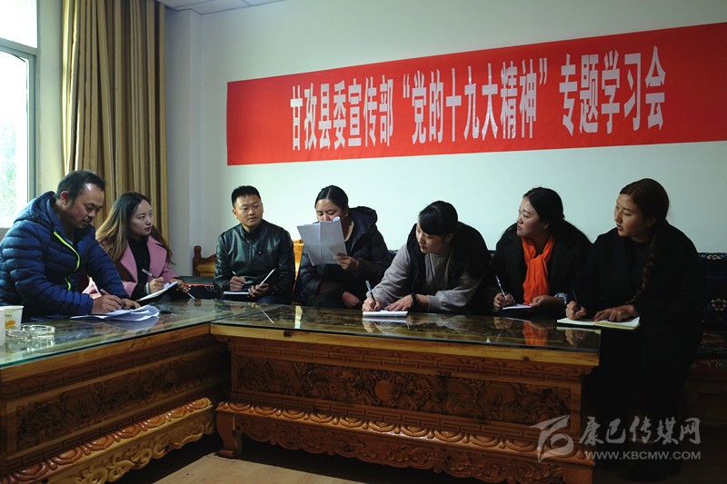 本網(wǎng)訊 (則瑪拉姆 文/圖)連日來(lái),甘孜縣依托中心組、干部講堂、“三級(jí)三講”等學(xué)教平臺(tái),圍繞“黨的十九大精神、《中國(guó)共產(chǎn)黨章程(修正案)》、習(xí)近平新時(shí)代中國(guó)特色社會(huì)主義思想、決勝全面建成小康社會(huì)”四大專題開展學(xué)習(xí),采取專家輔導(dǎo)講、專題研討學(xué)、集中考學(xué)評(píng)等形式,迅速組織廣大黨員干部原原本本學(xué)、聯(lián)系實(shí)際學(xué)、突出重點(diǎn)學(xué),切實(shí)把黨的十九大精神轉(zhuǎn)化為謀劃發(fā)展的思路、促進(jìn)發(fā)展的舉措、領(lǐng)導(dǎo)發(fā)展的能力和推進(jìn)發(fā)展的合力。圖為11月6日下午,縣委宣傳部組織全體職工專題學(xué)習(xí)黨的十九大精神。
