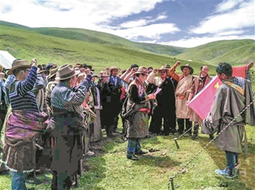 牧民黨員在帳篷前重溫入黨誓詞。
