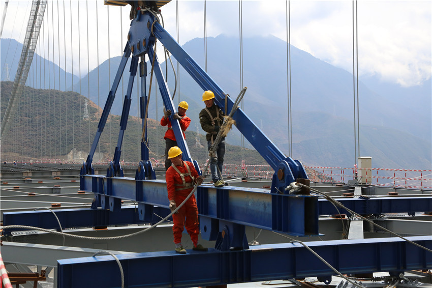 興康特大橋作為高海拔、高地震烈度山區(qū)和復(fù)雜風(fēng)場(chǎng)環(huán)境下世界第一超大跨徑鋼桁梁懸索橋,面臨的最現(xiàn)實(shí)的困難就是復(fù)雜風(fēng)場(chǎng)。4月1日下午,大橋建設(shè)現(xiàn)場(chǎng)連綿不絕的大風(fēng)如期而至,工人們系上安全繩,迎著大風(fēng),對(duì)新吊裝的材料一個(gè)螺絲一個(gè)螺絲的擰緊。