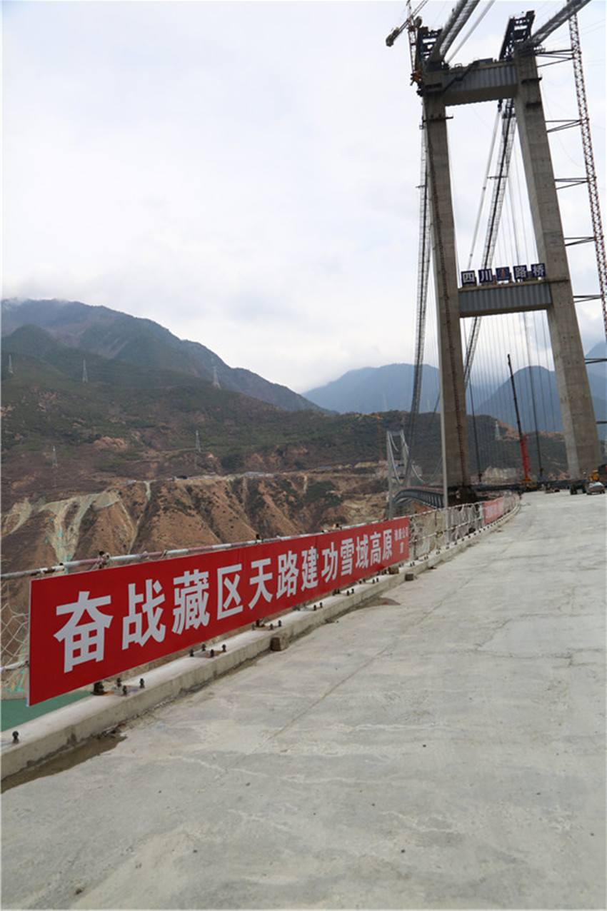 在瀘定橋上游不到5公里的地方,單跨達(dá)1100米的興康特大橋正在修建。作為高海拔、高地震烈度山區(qū)和復(fù)雜風(fēng)場(chǎng)環(huán)境下世界第一超大跨徑鋼桁梁懸索橋,以其極高的施工難度,成為名副其實(shí)的“川藏第一橋”。