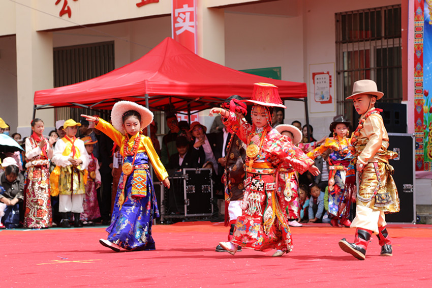 在縣城小,孩子們隨著民族音樂特有的旋律舞動(dòng)身姿,踏著歡樂的舞步跳起鍋莊,讓人仿佛置身于大草原。孩子們還穿著各式各樣的藏式民族服裝進(jìn)行了一場(chǎng)服飾秀表演。