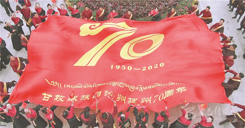 美妙的歌聲縈繞四方,鮮艷的旗幟迎風(fēng)飄揚(yáng)。就在眾人忘情高歌之時(shí),來自州歌舞團(tuán)的50多名演員將一面巨大的印有“建州70年Logo”的紅旗,在廣場正中鋪展開來。以這面旗幟為中心,先后到來的人們組成了三個(gè)同心圓,用歌聲禮贊甘孜州建州70周年。
