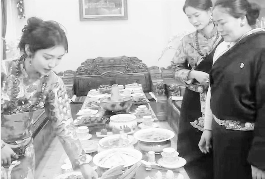 在藏裝制作點,主持人穿上縫紉藝人們親手制作的服裝,無論布料、絲線的選用,還是精致繁復(fù)的技藝,都充滿了濃厚的鄉(xiāng)土氣息和民族特色。每一針每一線,都蘊含著藝人們的心血與智慧。她們憑借著精湛的手藝,將絢麗多彩的布料剪裁、縫合,賦予其靈動的生命力。石渠服飾十分重視色塊與整體的相襯與和諧,以紅、黃、藍(lán)、綠、白、黑為主,呈現(xiàn)了石渠人民尊重自然的生態(tài)美。