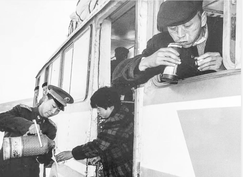 筆者看到在不遠(yuǎn)處的展板上,幾張老照片訴說著茶水站的歷史:20世紀(jì)90年代初的川藏線上,人煙稀少,路過的司機(jī)不僅吃不上熱飯,有時連口熱水都喝不上。為此,該雷達(dá)站時任指導(dǎo)員劉寶森帶領(lǐng)官兵搭起簡易小木棚。有車輛經(jīng)過時,值班官兵就高高舉起暖瓶,示意司機(jī)停車喝水。