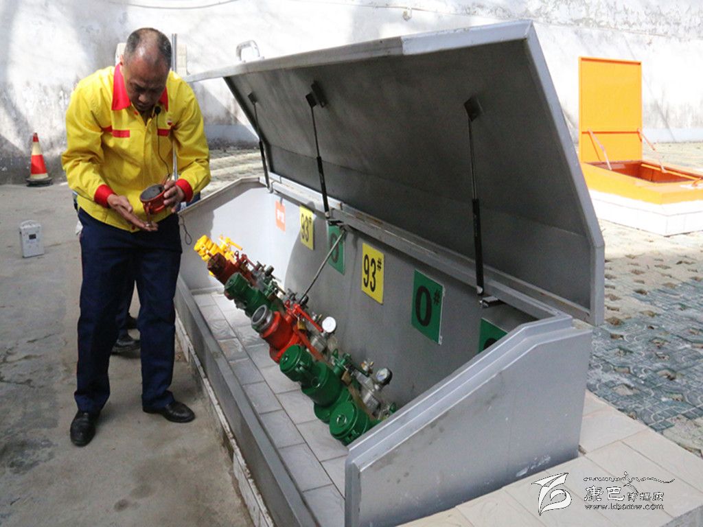 加油站管理人員正在檢查卸油口的安全。