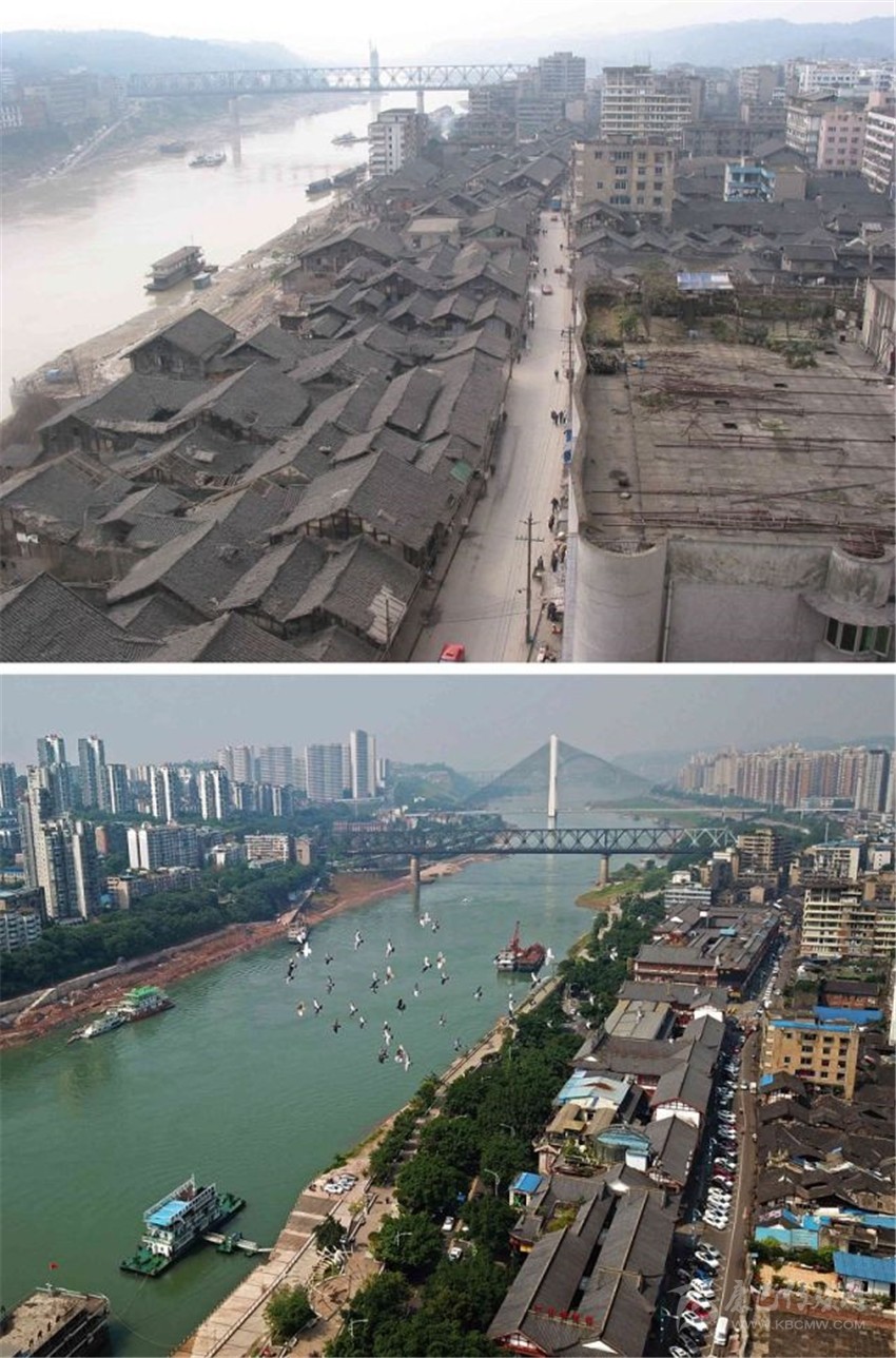 拼版圖片:上圖為2014年7月拍攝的宜賓市南溪區(qū)兩岸江景;下圖為2016年4月在同一視角拍攝的畫面。新華社發(fā)(曾朗攝)