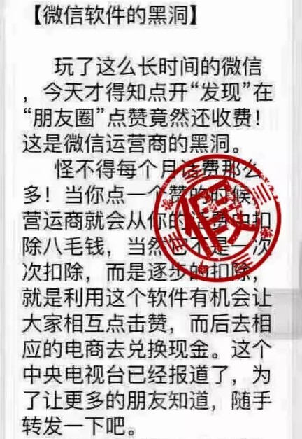 近日,微信群中流傳一條消息稱:“玩了這么長時間的微信,今天才得知點贊竟然還收費。當你點一個贊的時候,運營商就會從你的話費中扣除八毛錢……中央電視臺已經報道了?!?/p>
