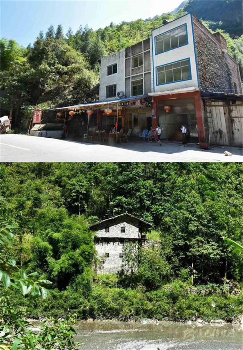 朱國(guó)富家的老屋(下)和現(xiàn)在居住的房子——家、店合一的“黑灣魚(yú)莊”。張可凡攝。