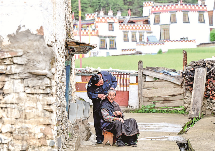每個(gè)月,在忙完派出所的工作之余,呷老多燈就會(huì)帶著提前準(zhǔn)備好的大米、油、面、肉等生活用品送到老人家中。然后自己秒變“托尼老師”,為老人理發(fā)。平時(shí),只要有時(shí)間,呷老多燈就會(huì)來(lái)到擁中呷的家中,陪她聊聊天,讓老人不再孤獨(dú)。面對(duì)這般不期而至的溫情,擁中呷老人飽含淚花地說(shuō):“感覺(jué)自己的兒女回家了!”
